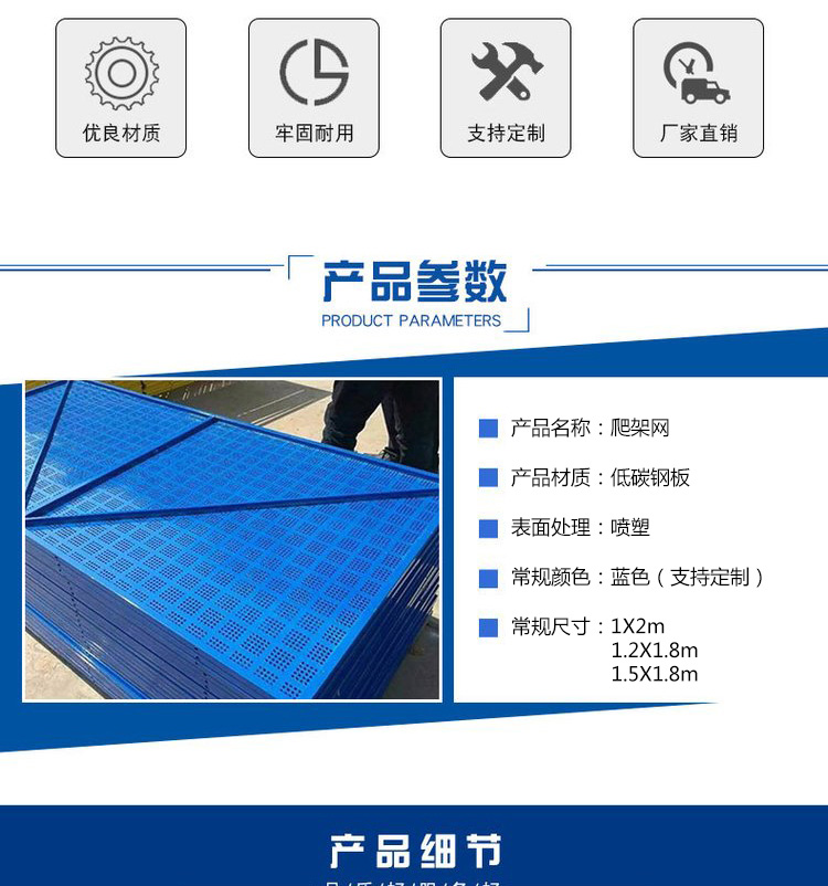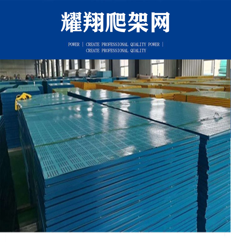 爬架網(wǎng)片重量輕,方便安裝。顏色多種,常用顏色有藍(lán)色,……