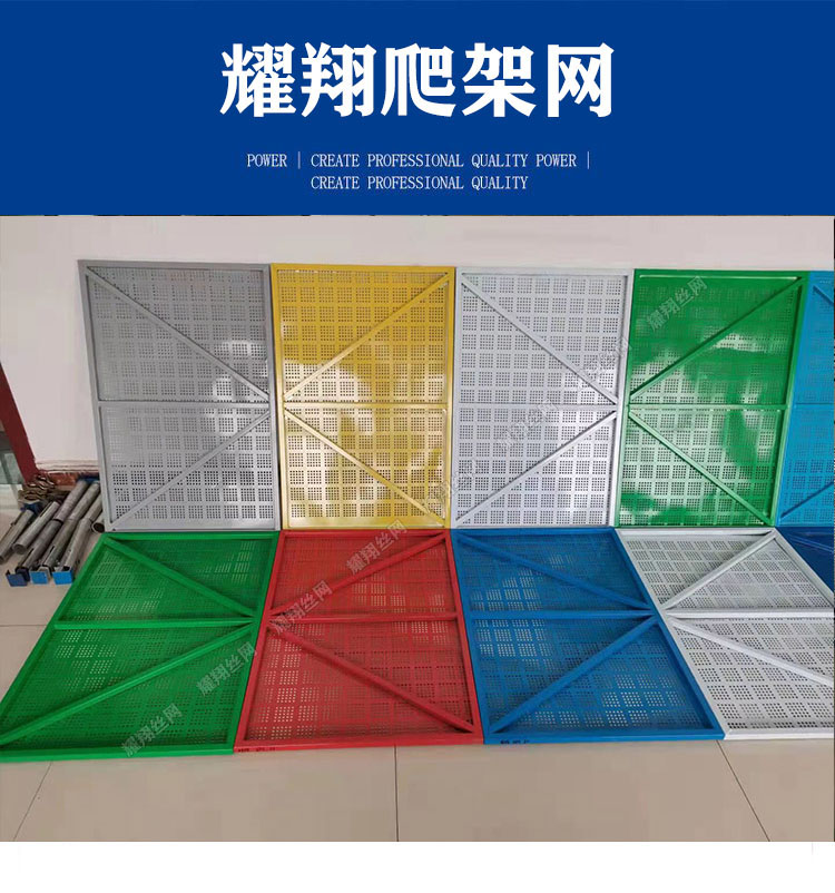 爬架網(wǎng)是鍍鋅爬架網(wǎng)片和鍍鋅方管組裝成的建筑防護(hù)網(wǎng),重量輕,方便安裝。顏色多種,常用顏色有藍(lán)色,黃色、綠色等,也可根據(jù)客戶需求定制顏色;樣式一般分為半米字型爬架網(wǎng)、全米型爬架網(wǎng)、鍍鋅爬架網(wǎng)、圓孔爬架網(wǎng)、提升架防護(hù)網(wǎng)等,常規(guī)尺寸1.2mX1.8m、1.5mX1.8m、1mX2m等。爬架網(wǎng)為圓孔沖孔網(wǎng)設(shè)計(jì),有效降低產(chǎn)品重量,提高采光效果,即*又不會(huì)在施工過程中感到壓抑,材質(zhì)為金屬板網(wǎng)也有效降低了火災(zāi)發(fā)生的概率。