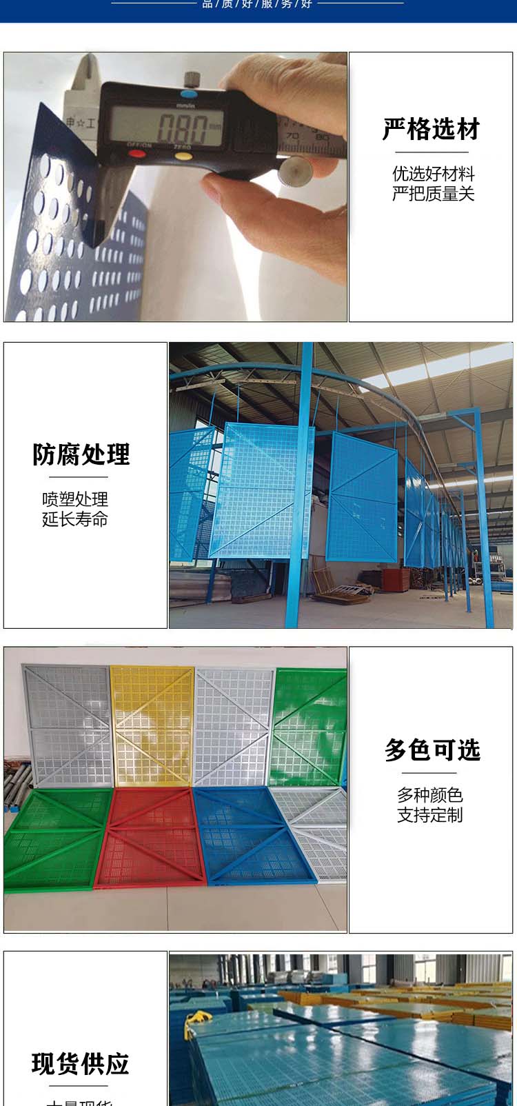 米字型爬架網(wǎng)是鍍鋅爬架網(wǎng)片和鍍鋅方管組裝成的*防護(hù)網(wǎng),重量輕,方便安裝。顏色多種,常用顏色有藍(lán)色,黃色、綠色等,也可根據(jù)客戶需求定制顏色;樣式一般分為半米字型爬架網(wǎng)、全米型爬架網(wǎng)、鍍鋅爬架網(wǎng)、圓孔爬架網(wǎng)、提升架防護(hù)網(wǎng)等,常規(guī)尺寸1.2mX1.8m、1.5mX1.8m、1mX2m等。爬架網(wǎng)為圓孔沖孔網(wǎng)設(shè)計(jì),有效降低產(chǎn)品重量,提高采光效果,即*又不會在施工過程中感到壓抑,材質(zhì)為金屬板網(wǎng)也有效降低了火災(zāi)發(fā)生的概率。